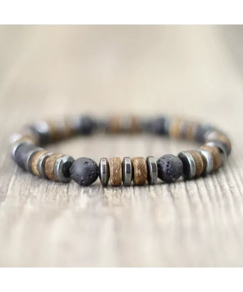Combine estilo e carácter com a nossa pulseira de pedra de lava vulcânica , madeira e metal.